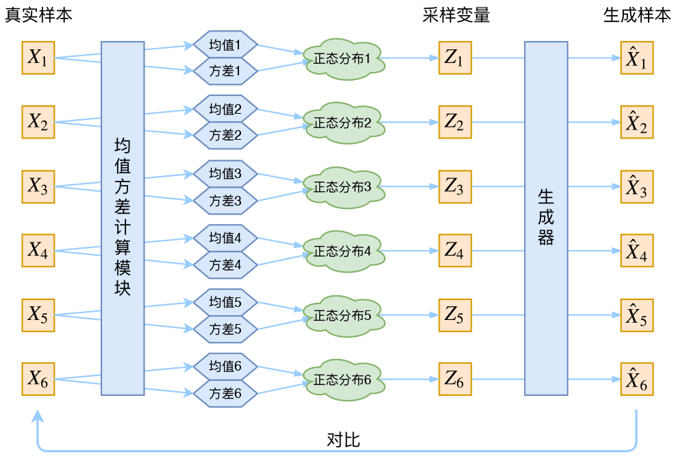 The model’s approach is: first sample a Z from the standard normal distribution, then calculate an X based on Z. If the VAE structure is indeed this diagram, we actually have no idea: whether the $Z_k$ re-sampled still corresponds to the original $X_k$.
