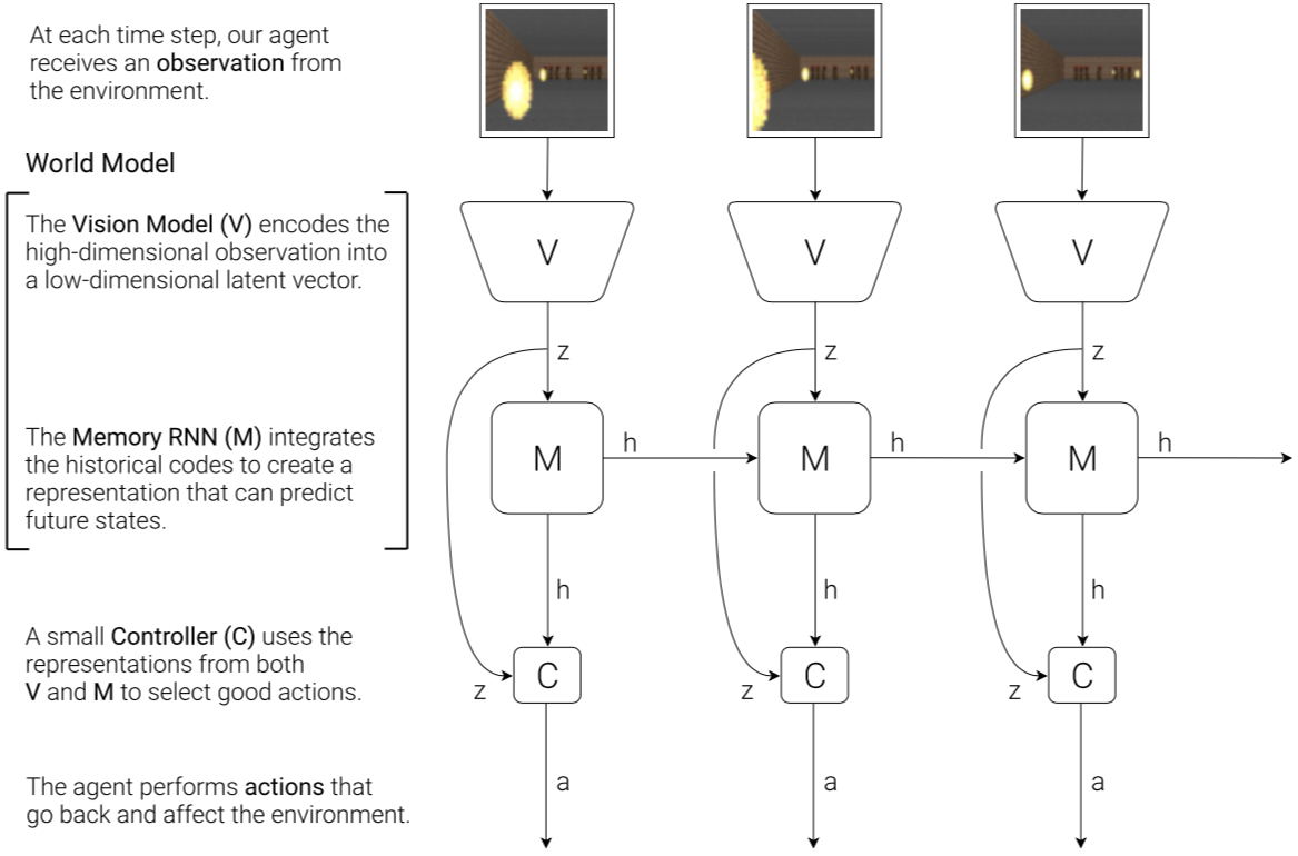 The flowchart below shows how $V$, $M$ and $C$ interact with the environment: First, at each time step $t$, the raw observation input is processed by $V$ to generate compressed $z(t)$. Then $C$‘s input is $z(t)$ and $M$‘s hidden state $h(t)$. Then $C$ outputs action vector $a(t)$ to affect the environment. $M$ takes the current moment’s $z(t)$ and $a(t)$ as input to predict the next moment’s hidden state $h(t+1)$.