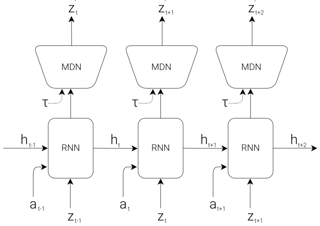 Where the prediction of the next moment $z*{t+1}$ is expressed in probability form as $P(z*{t+1}|a_t,z_t,h_t)$, where $a_t$ is the action at time $t$. And in the sampling stage, the model’s fuzziness is controlled by adjusting the temperature parameter $\tau$. (This parameter is very effective for subsequent training of controller $C$)