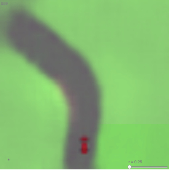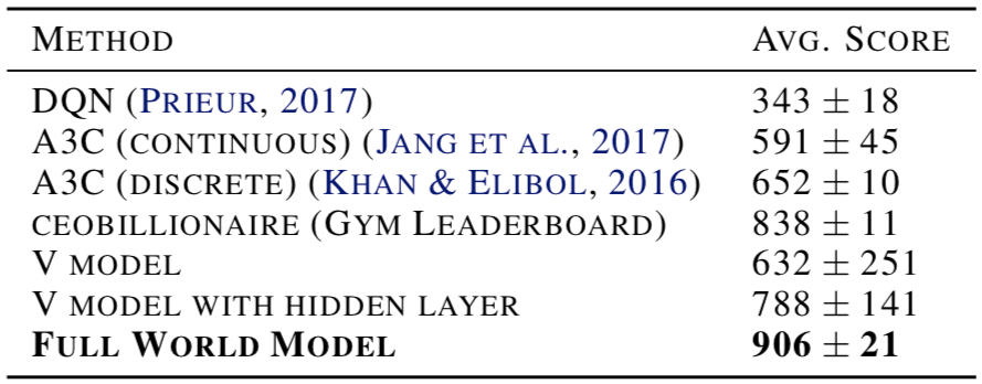Complete world model (VAE+MDN-RNN) Experimental results show that the Agent drives more stably. Because $h_t$ contains the probability distribution of information about the future of the current environment, the Agent can make judgments as quickly as Formula 1 drivers and baseball players.