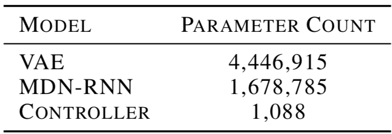 Therefore, the controller is a simple single-layer linear model: $$a_t=W_c[z_t h_t]+b_c$$